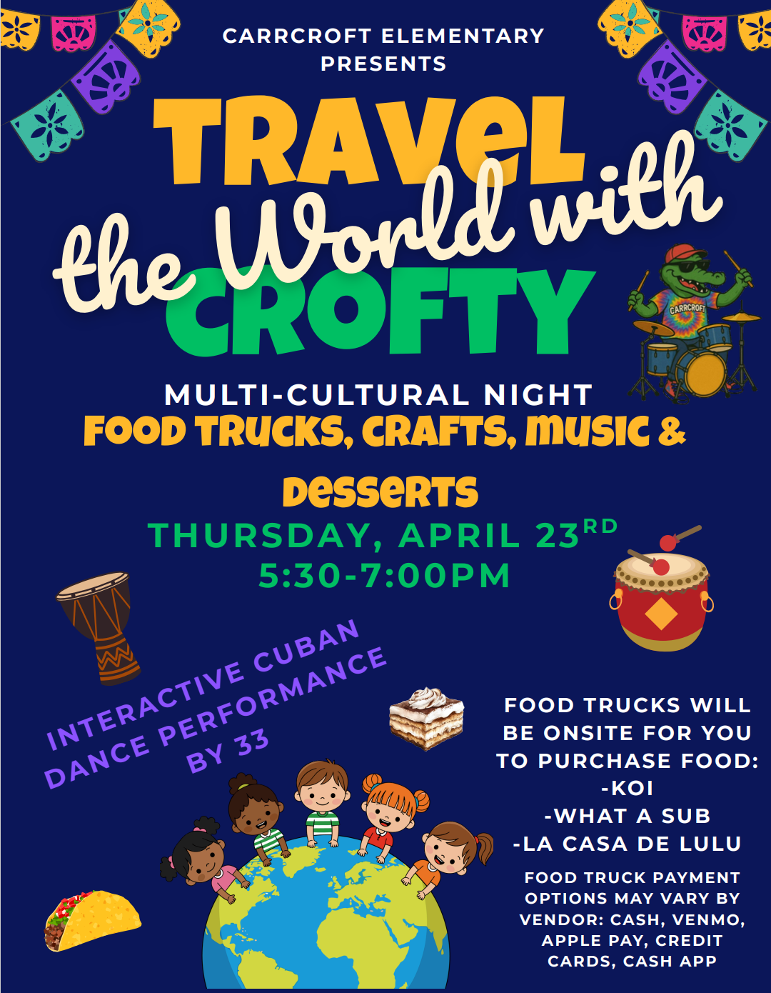 CCA April 20, 2026 Carrcroft Elementary Presents! CCA April 20, 2026 … a multi-cultural themed night of food, crafts and music! Please see the below flyer for details! 🎉